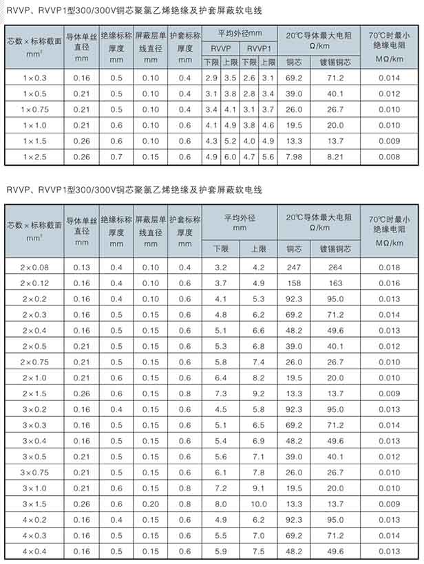AVP(銅芯聚氯乙烯絕緣屏蔽電線)、AVP-105(銅芯耐熱150℃聚氯乙烯絕緣屏蔽電線)、RVP(銅芯聚氯乙烯絕緣屏蔽軟電線)、RVP-105(銅芯耐熱150℃聚氯乙烯絕緣屏蔽軟電線)、RVVP(銅芯耐熱150℃聚氯乙烯絕緣屏蔽聚氯乙烯護套軟電線)、RVVP1(銅芯耐熱150℃聚氯乙烯絕緣纏繞屏蔽聚氯乙烯護套軟電線)