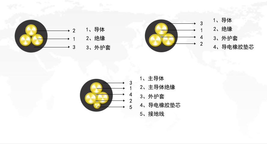 其結(jié)構(gòu)由內(nèi)至外分別為:1、導(dǎo)體2、絕緣3、填充4、包帶5、外護(hù)套